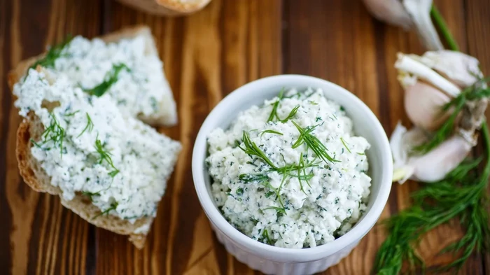 - Lägg surmjölksost, vitlök, dill, svartpeppar, salt och mixa i en mixer tills den är slät.